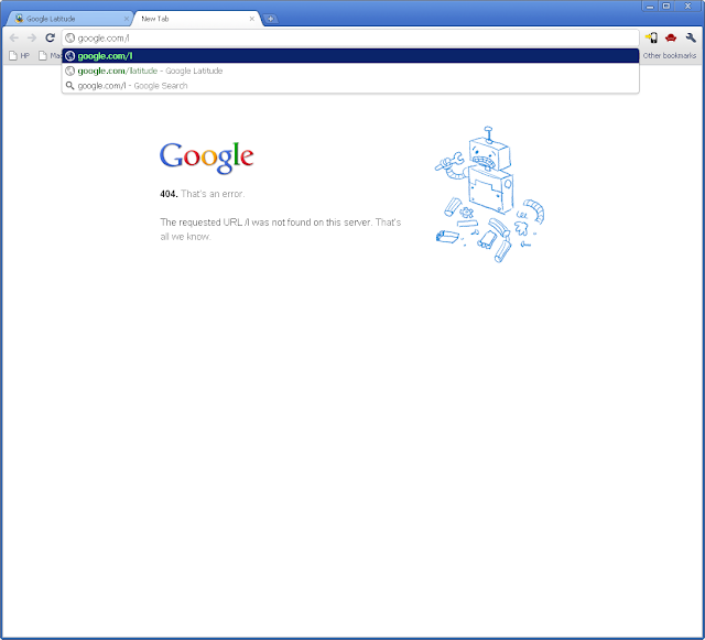 I've never encountered a Google 404 until today. It's pretty cute. This page loaded while attempting to hit Google Latitude because I enabled Chrome Instant in the Omnibox. I was typing google.com/latitude and had reached "google.com/l" when this page appeared.